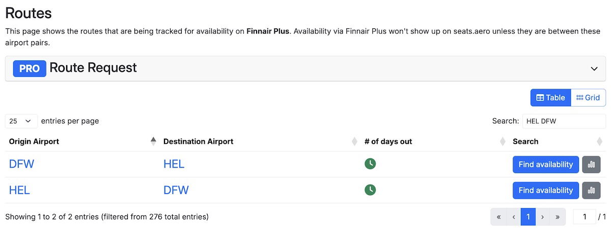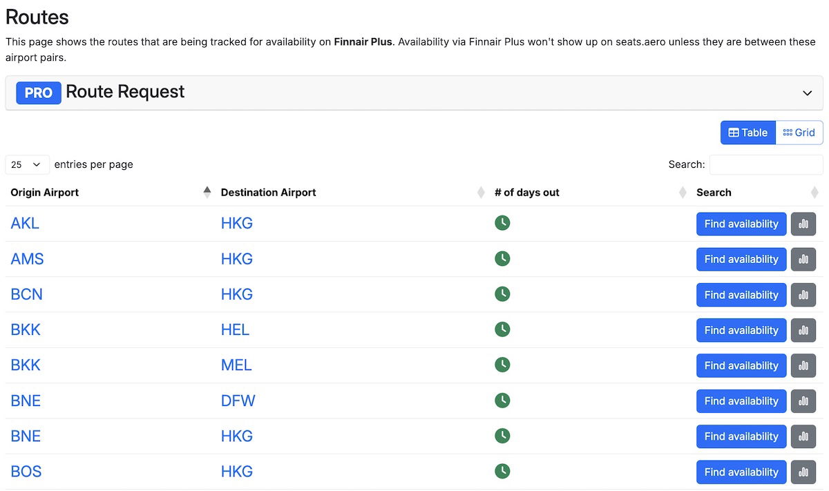 For example, say you select Finnair Plus as the program. You’ll see a list of all routes that Seats.aero has award availability for with Finnair Plus (again, let me emphasize that this also applies to partner airline availability).