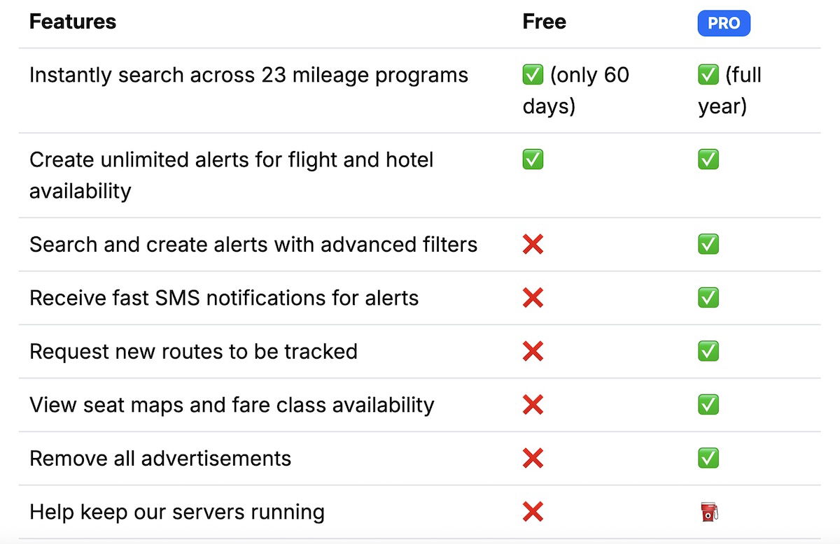 One awesome thing about Seats.aero is that you can use the site for free, though with limited capabilities. Still, I’d say the free services can add a lot of value. Alternatively, you can buy a pro plan for $9.99 per month or $99.99 per year. That offers the following three primary incremental perks (in addition to supporting the site):