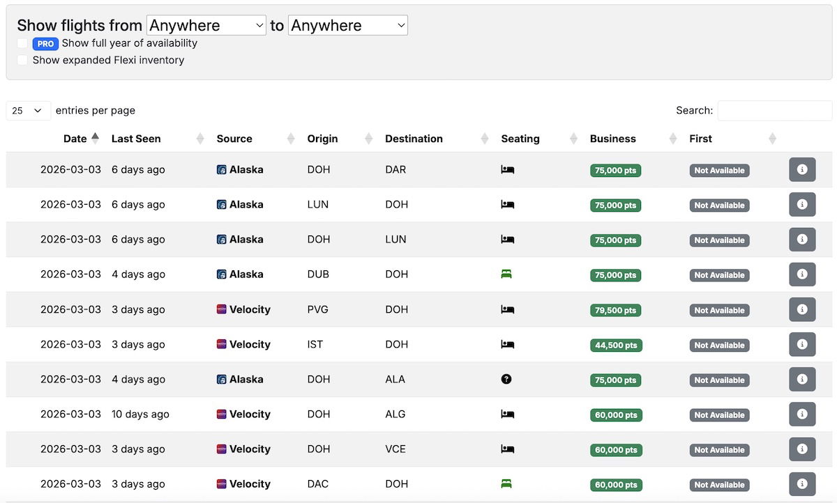 Qatar Airways business class awards with Seats.aero