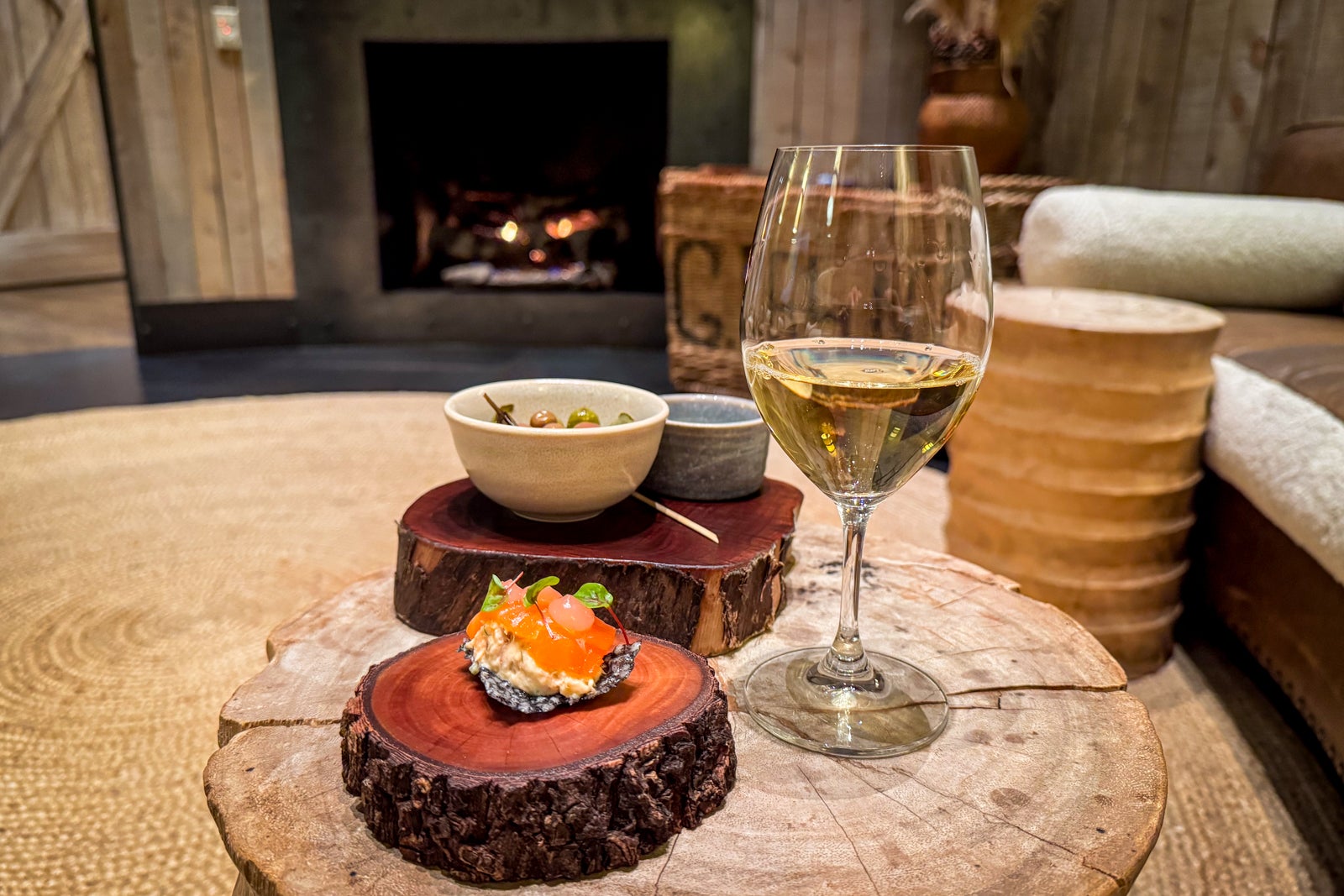 The look here is what I’d describe as contemporary alpine. With huge windows and lots of white wooden paneling, the main lodge building includes a plethora of cozy seating nooks, both indoor and outdoor, heated by crackling fireplaces. These are lovely settings for a pre-dinner aperitif and canapes.