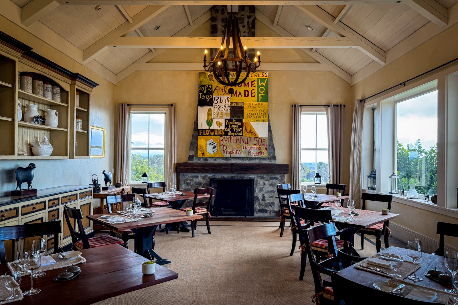 Designed with a farmhouse-chic aesthetic (indeed, you’ll find antique farming tools and repurposed farm and ranch equipment incorporated into the decor), the overall feel is both rustic and cozy. There’s plenty of exposed stone, wooden beams, cheeky alpine flair like antler chandeliers and, of course, panoramic windows with sweeping views of this particularly dramatic stretch of coastline.