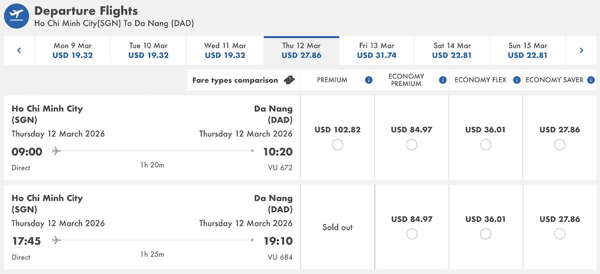 The airline primarily operates domestic flights within Vietnam, which… is a pretty competitive market. So after looking up the route network, I had the next logical question — who gets to fly in the former Spirit Airlines Big Front Seats? So I looked up some fares, and it seems like Vietravel Airlines does have “premium” fares on flights operates by the two former Spirit planes, which book into those bigger seats.
