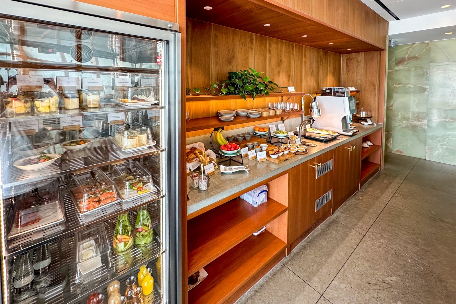 The Cathay Pacific Business Class Lounge in Terminal 3 is certainly one of our favorite lounges to visit when passing through Heathrow. Inside, you’ll be greeted by tasteful decor (think: wood paneling and black light fixtures, vivid green tiling around the manned food station and leafy green plants scattered throughout).
