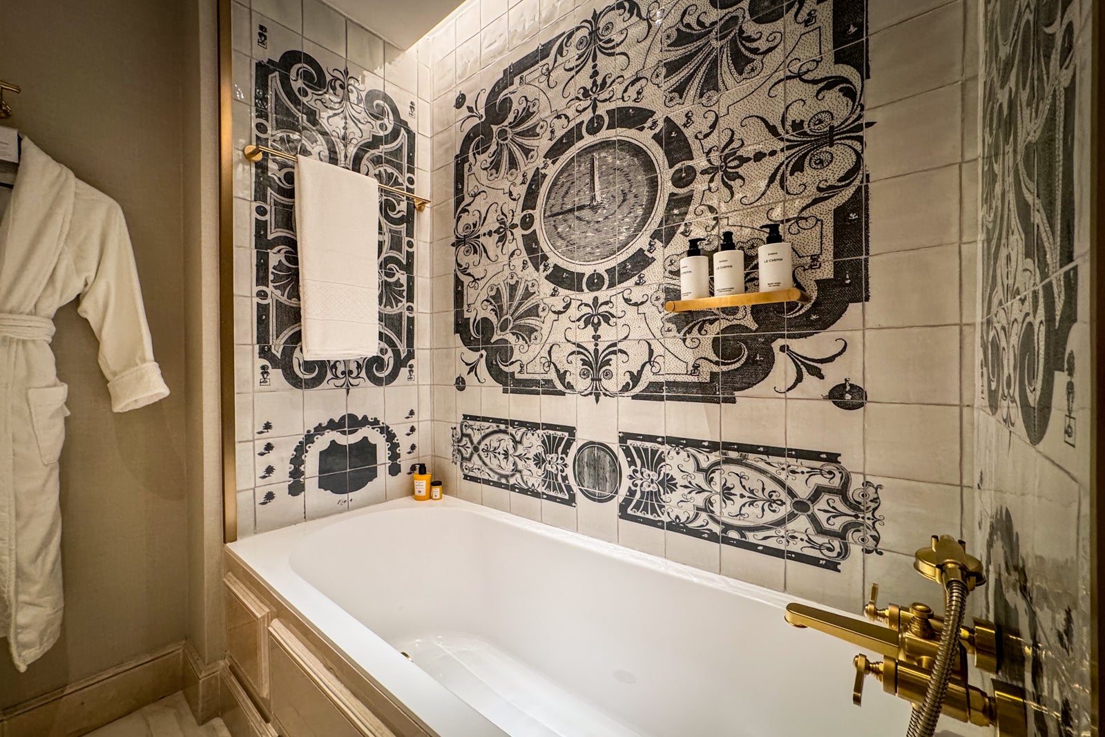 The bathroom was clad in cream- and brown-toned marble — a holdover from the hotel’s former look. However, it featured new brass light fixtures and faucets and, even more eye-catching, there was a tiled backsplash of blue and white Talavera tiles depicting an aerial view of the Royal Botanical Gardens.