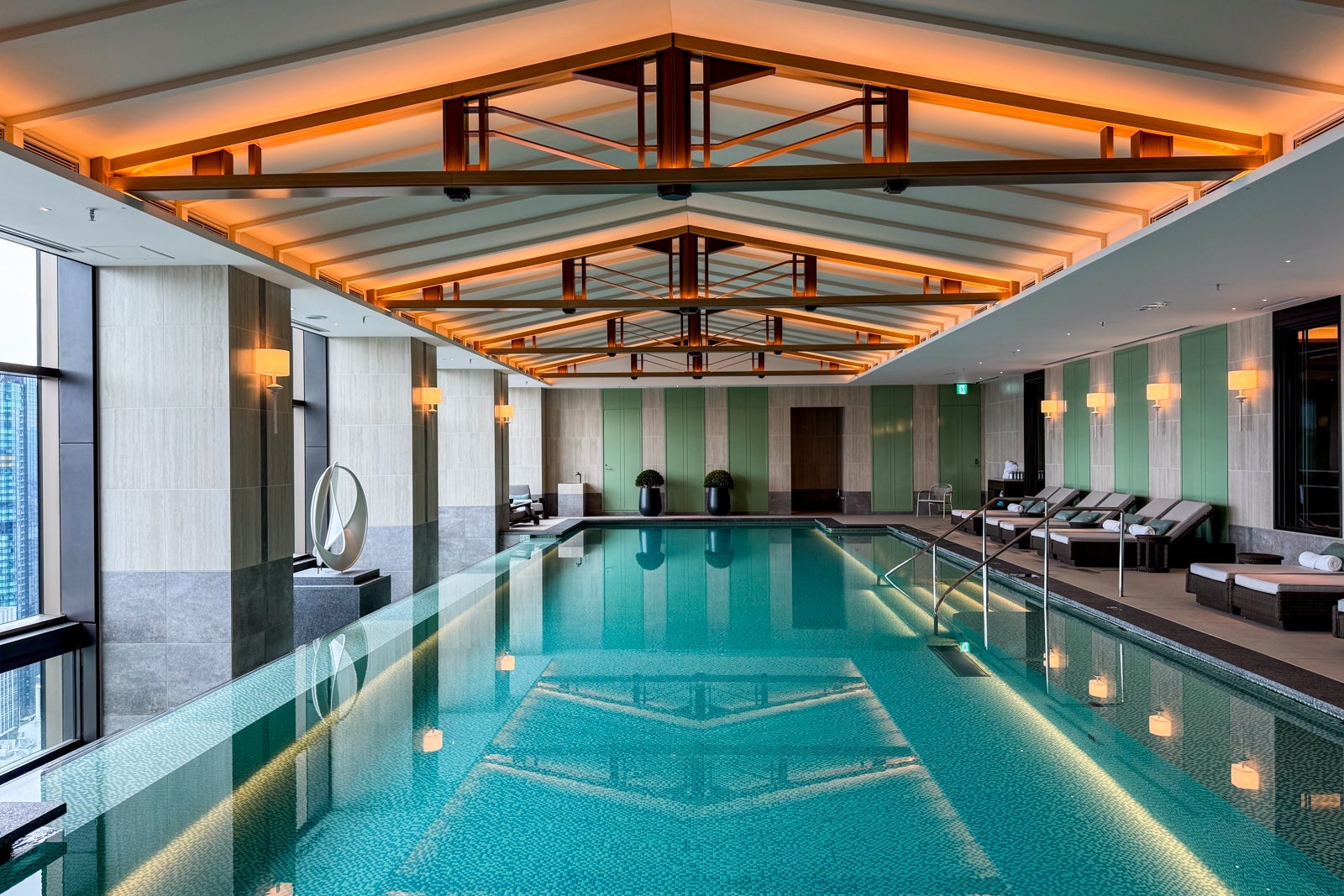 The hotel was designed by André Fu, and its focal point is its spectacular all-day bar and restaurant, Peacock Alley, which has soaring ceilings and dramatic chandeliers, all overlooking the surrounding skyline through enormous windows. The reception area, meanwhile, was inspired by traditional wooden Japanese lanterns and has a stunning black stone reflecting pool strewn with Setouchi boulders. The green, blue and gold palette of the guest rooms reflects Japan’s indelible land and seascapes, along with plenty of age-old Japanese crafts like kumiko screens and washi wallpaper. While here, be sure to sit down to a dinner of sizzling seasonal specialties at the teppanyaki restaurant Tsukimi, and book a La Prairie treatment at the spa.