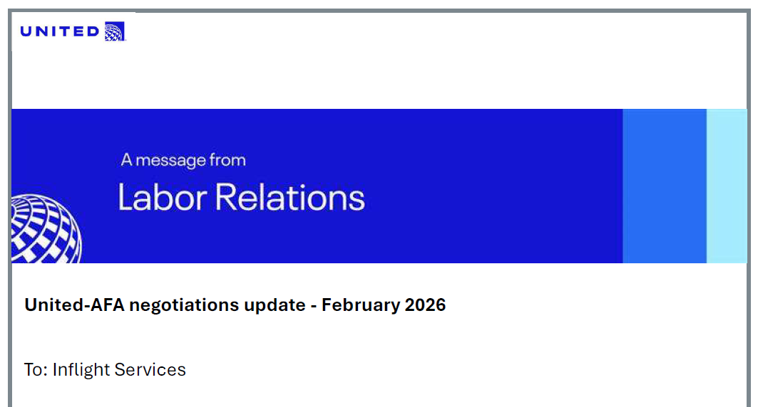 United Airlines flight attendants haven’t had a raise in 5 years. The airline points out in this new message – correctly – that the AFA-CWA union delayed negotiations with the airline, preferring to see the American Airlines contract get done first. (That’s because American’s flight attendants would get a new deal that could be a starting point for United crew to negotiate off of – and because if a strike were necessary to get there, it would be a different union’s members bearing the cost.)