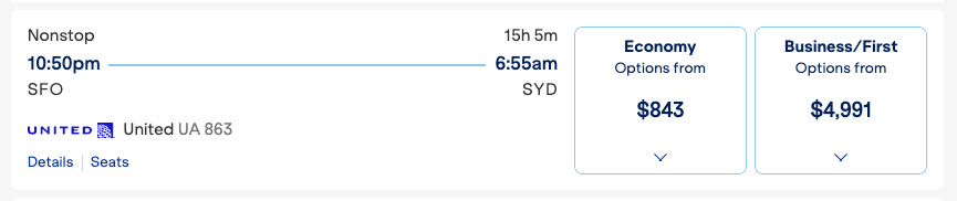 Likewise, you can now book United flights right on JetBlue’s website — like this nonstop United flight from San Francisco International Airport (SFO) to Sydney Airport (SYD).
