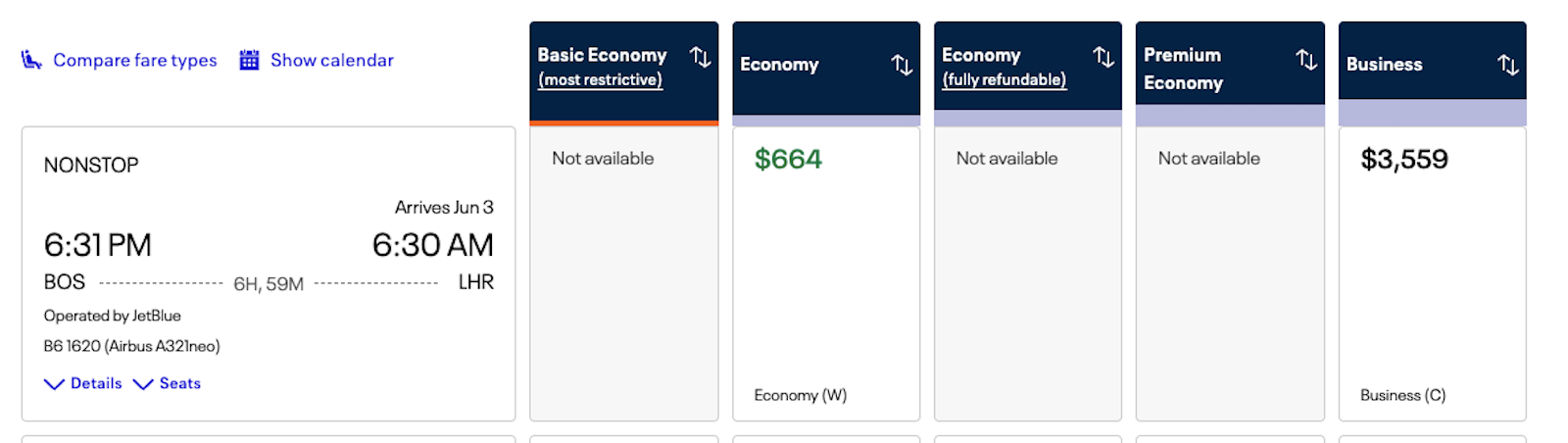 You can now book most JetBlue flights right on United’s website. That goes for both cash and award bookings. For instance, if I hop on United.com, here’s a nonstop option from Boston to London for this summer — operated by JetBlue.