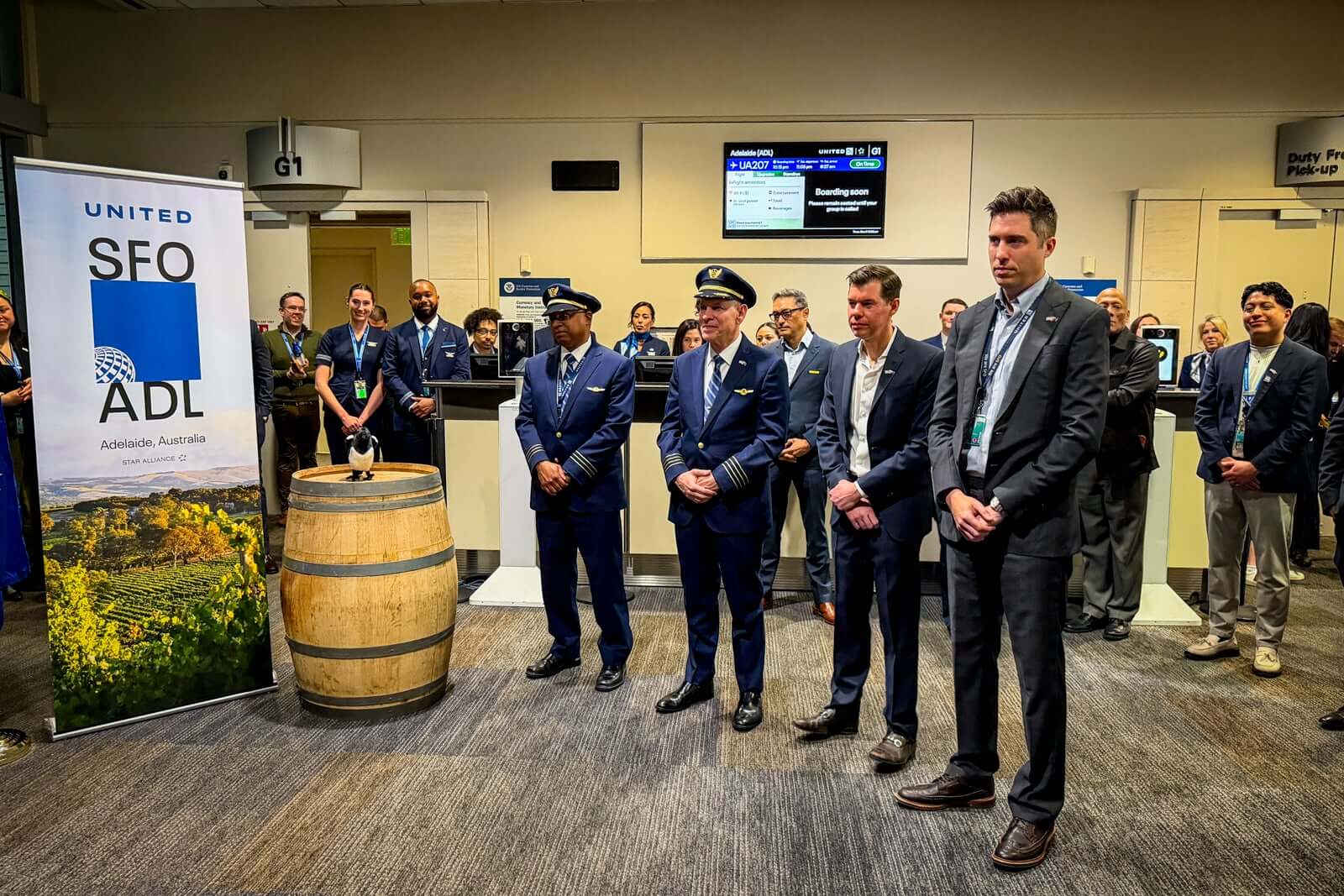 “Today’s flight marks the first nonstop service between the United States and Adelaide,” he said during his gateside remarks, touting his airline’s place in the market. “United is proudly the leading carrier across the Pacific and the only carrier to offer nonstop service between the U.S. and four major cities in Australia.”