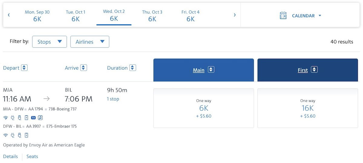 Want to fly from Miami to Dallas to Billings? That’s bookable for just 6,000 AAdvantage miles in economy or 16,000 AAdvantage miles in first class.