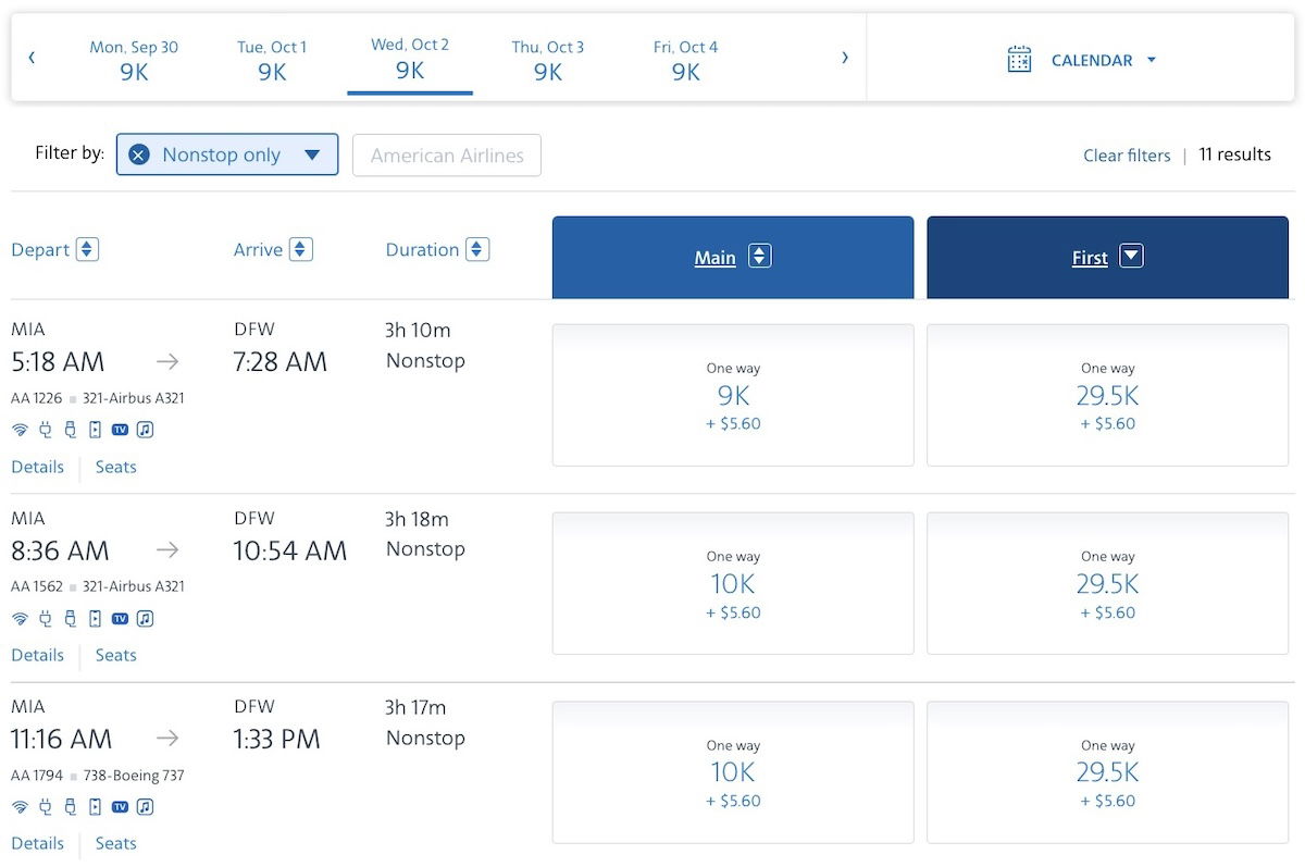 Want to fly just that first segment from Miami to Dallas? That’ll cost you 10,000 AAdvantage miles in economy or 29,500 AAdvantage miles in first class.