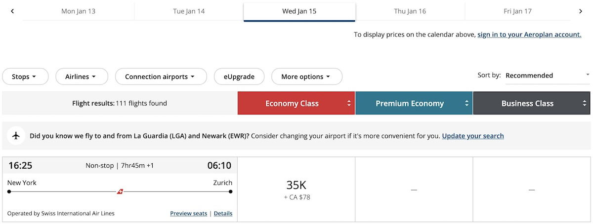 Take the below example of trying to redeem Air Canada Aeroplan points online. You can book a business class award on SWISS from New York to Berlin via Zurich.