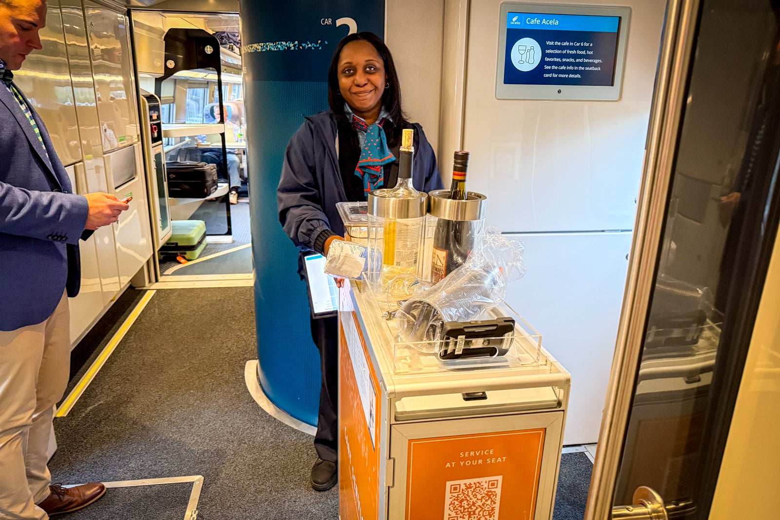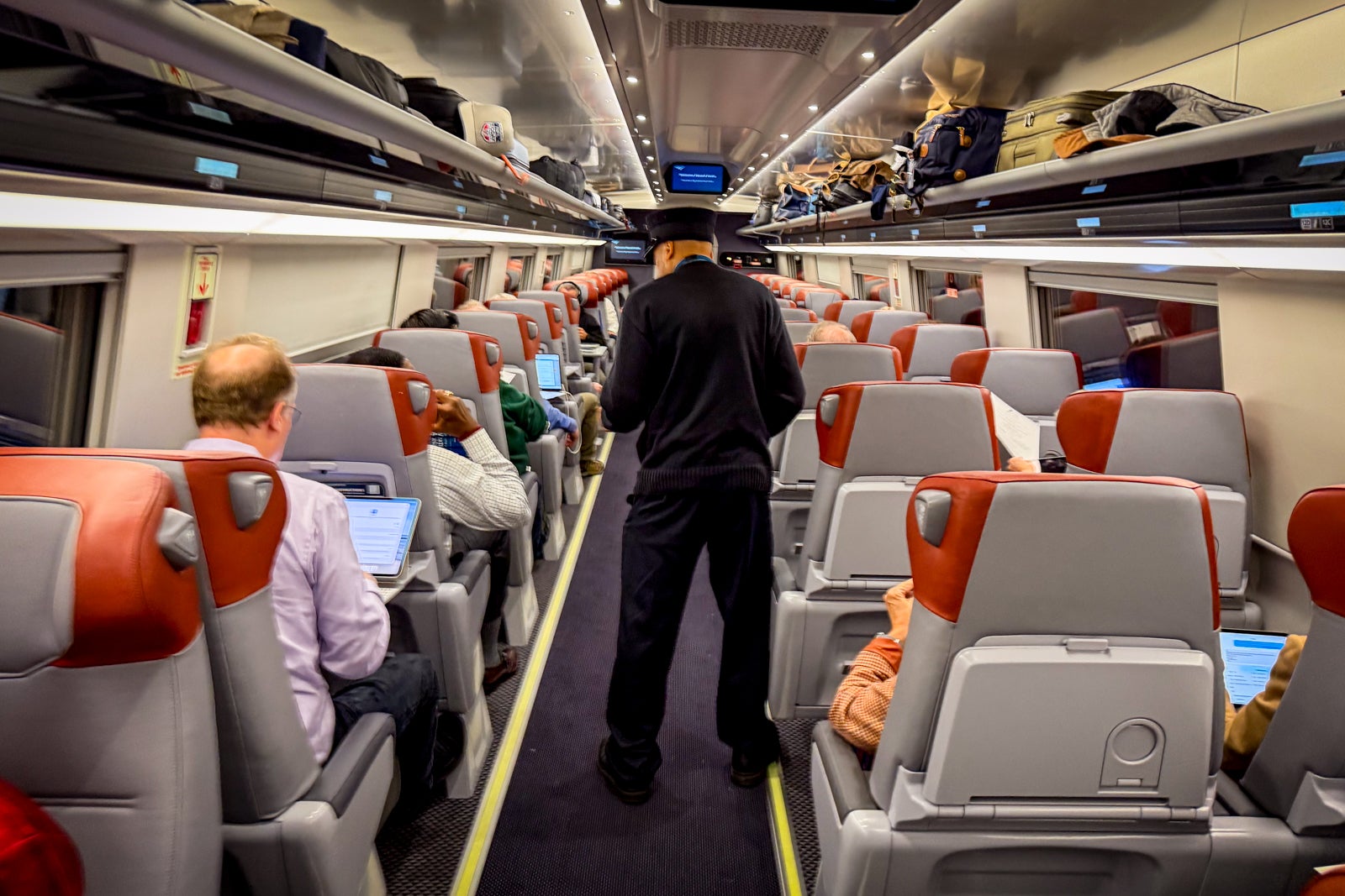 Boarding was chaotic with a long line to get into the first-class car. It wasn’t the workers’ fault, though, as there was a passenger in a motorized wheelchair who needed to be boarded before the rest of the passengers. We ended up leaving the station about 15 minutes late.
