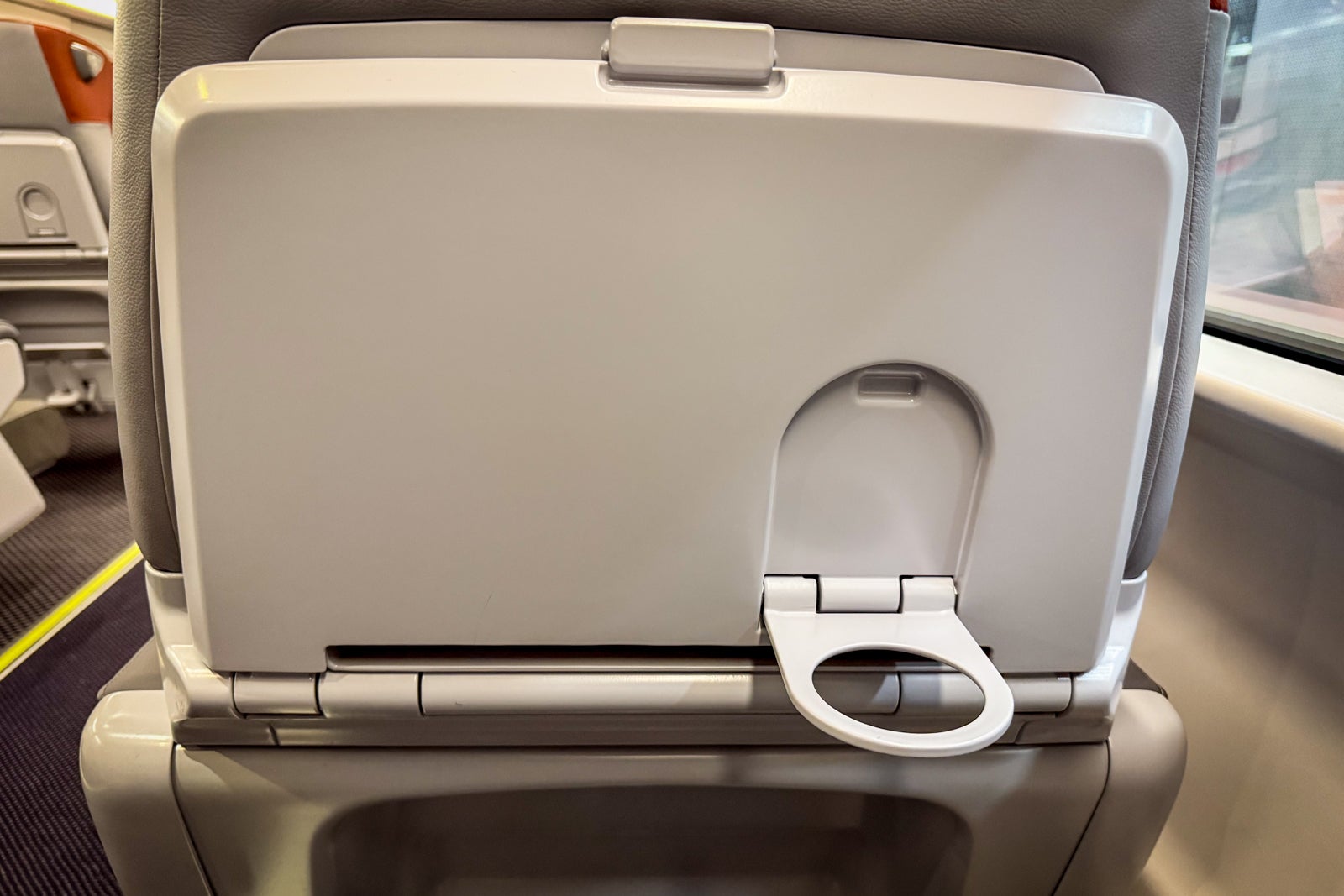 Similar to first class, there are tray tables and leg rests at every seat. A seatback pamphlet describes the food available in the cafe car or via cart service.