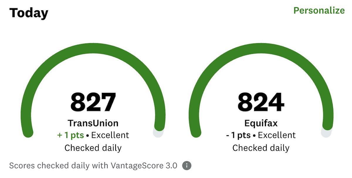 My Equifax and Transunion credit scores are currently 824 and 827, respectively, which is better than a vast majority of consumers. To be honest, my score is lower than it was several months back (when it was as high as 840), as I’ve applied for quite a few cards, and have been a bit sloppy with keeping my card utilization really low.