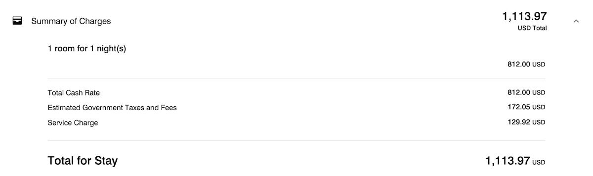 However, if you then look at the total charges, you’ll see that after taxes and service charges, the stay would cost $1,114 if paying cash. You’re now getting ~1.05 cents of value per point, which is much better.