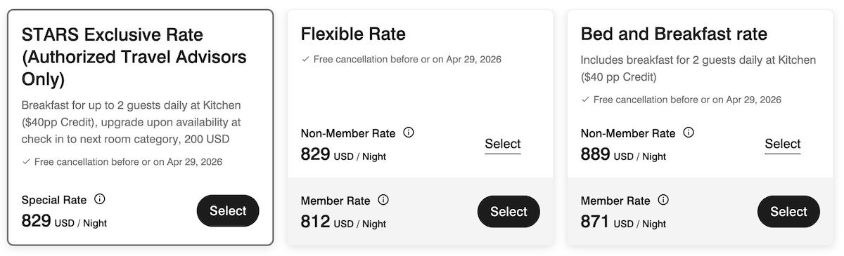 Let’s use the same EDITION example above. The Marriott STARS rate would be $829 per night (before taxes and fees), and for booking that you’d receive a $200 hotel credit once per stay, daily complimentary breakfast (which Marriott Platinum members and above don’t otherwise receive at EDITION), a room upgrade, and more.