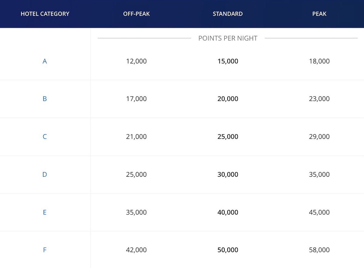 Next, World of Hyatt has an all-inclusive award chart, which applies to an ever-growing number of properties across Hyatt’s 10 all-inclusive brands. Hotels fall into one of six categories, with the similar off-peak, standard, and peak pricing periods. Pricing ranges from 12,000 points for a Category A property during an off-peak period, to 58,000 points for a Category F property during a peak period.