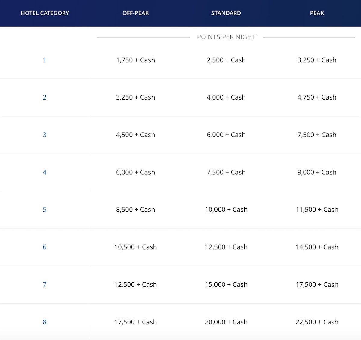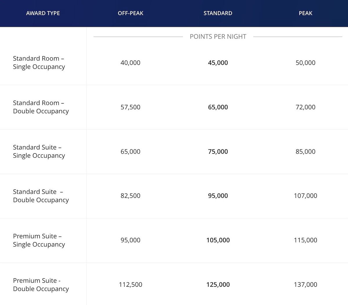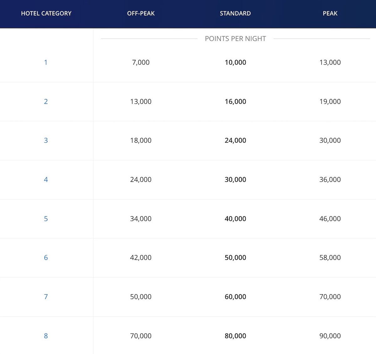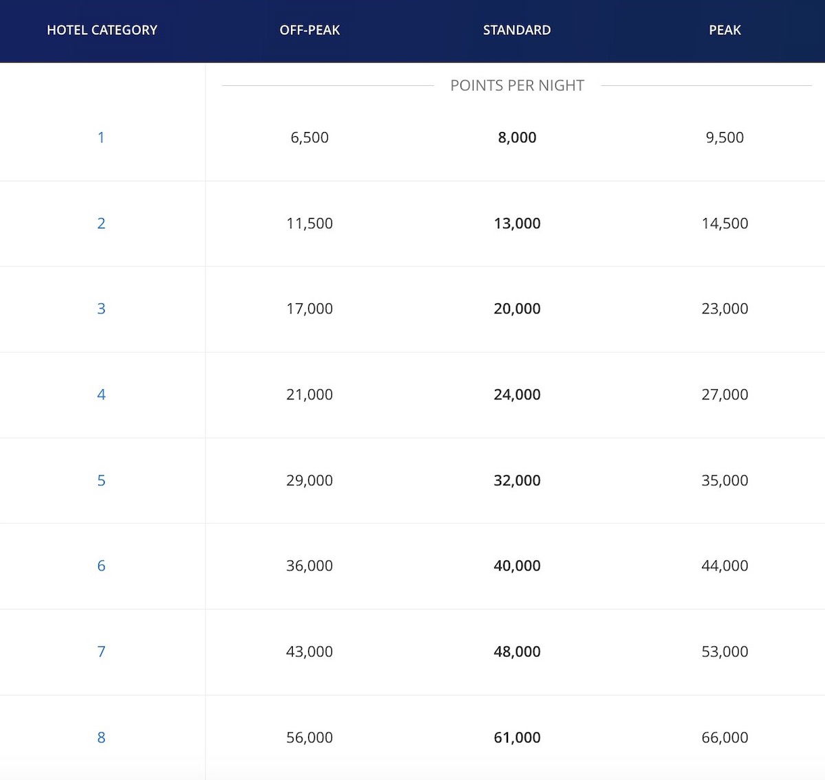 The standard award chart applies at a vast majority of properties globally, including most Hyatt branded properties. There are eight categories of hotels, and 24 different pricing tiers, given off-peak, standard, and peak pricing within each category. Pricing ranges from 3,500 points for a Category 1 property during an off-peak period, to 45,000 points for a Category 8 property during a peak period.