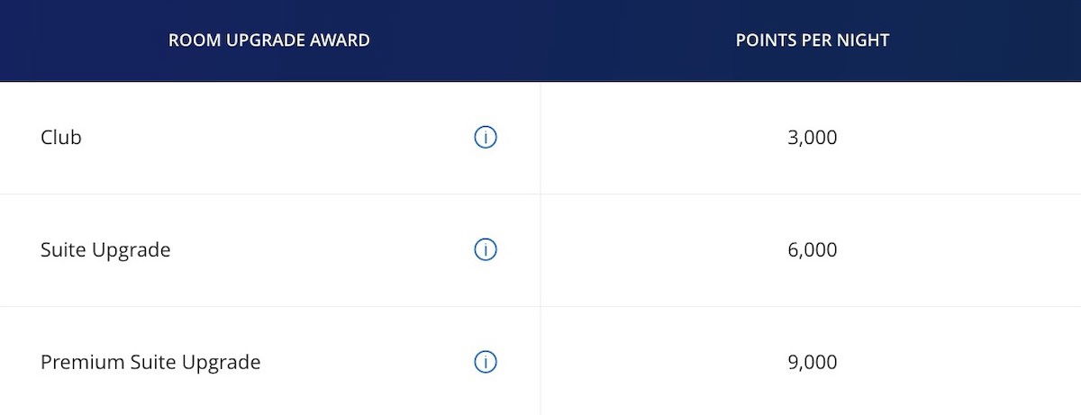 World of Hyatt also lets you upgrade to club rooms, suites, and premium suites, using points. You can find the chart for that below, though note that this is only possible when booking a fully paid stay at the flexible rate directly with Hyatt. This requires a rate code, so it’s not even combinable with Hyatt Privé rates.