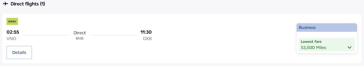 …while a Vilnius (VNO) to Dubai (DXB) flight would cost 25,000 points in economy or 45,000 points in business class.